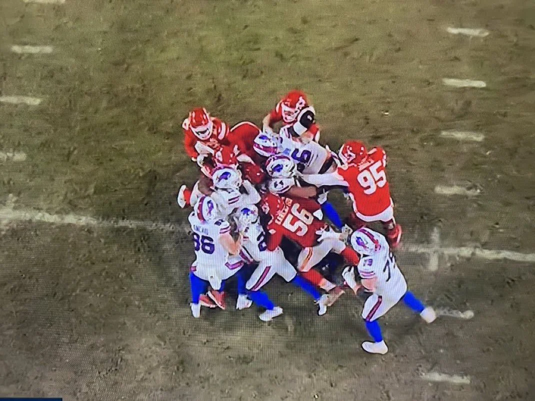 The refs went into a video review, and the call stood (meaning they had no evidence to confirm or overturn the initial ruling). But in the picture to the right, Allen, the player in the middle of the pile, is clearly over the 40-yard line, where the first down markers were. The refs gave the Chiefs the ball, and they ended up scoring on that drive to put them up 29-22. The Chiefs should never have gotten the ball in the first place, and Buffalo, who was at the Kansas City 40, was just a play or two away from being in field goal range at least. If Buffalo had gotten a field goal on that drive, and everything else stayed the same, the score would have been 32-32 at the end of regulation. Who knows what could have happened in overtime?